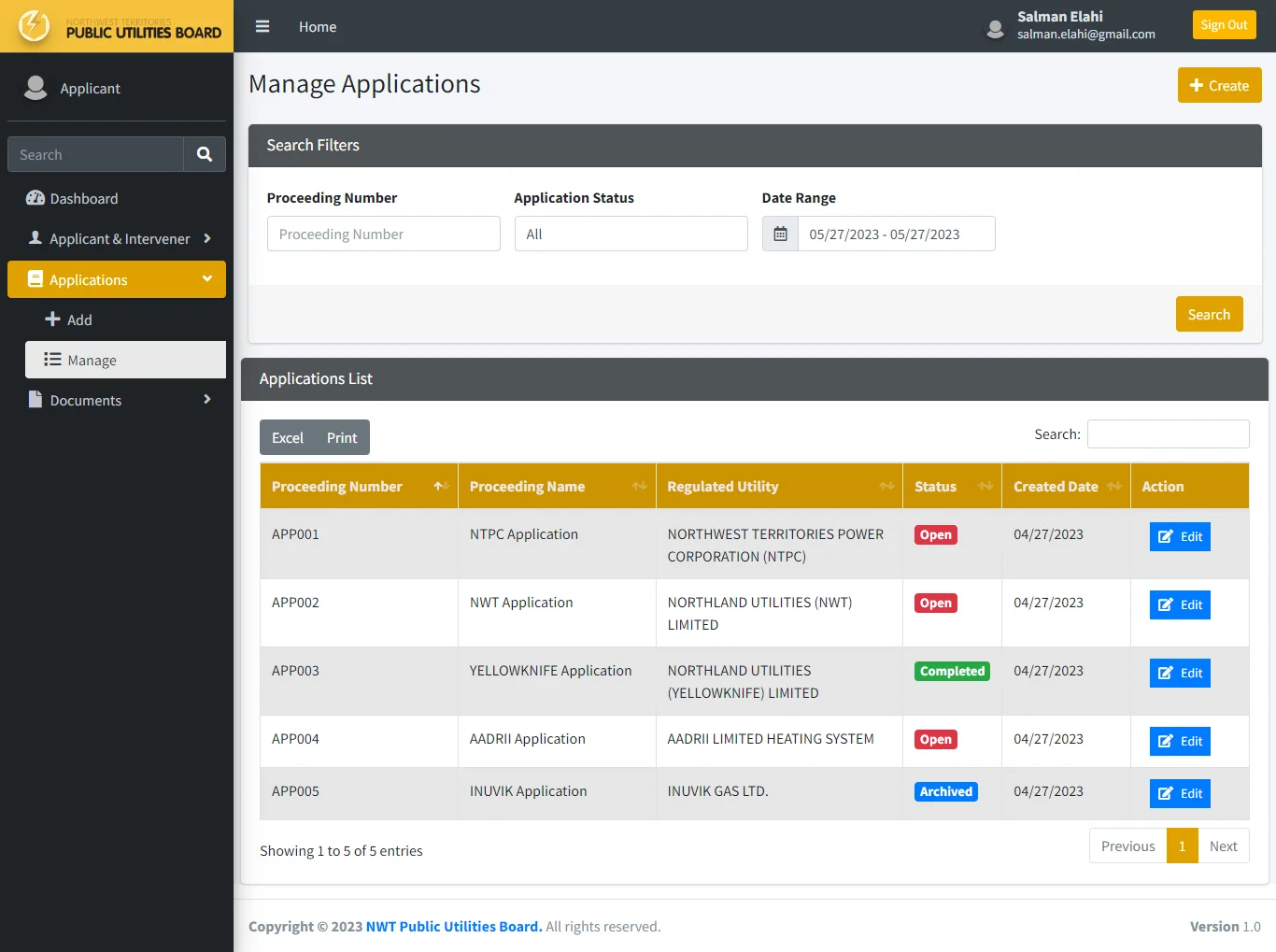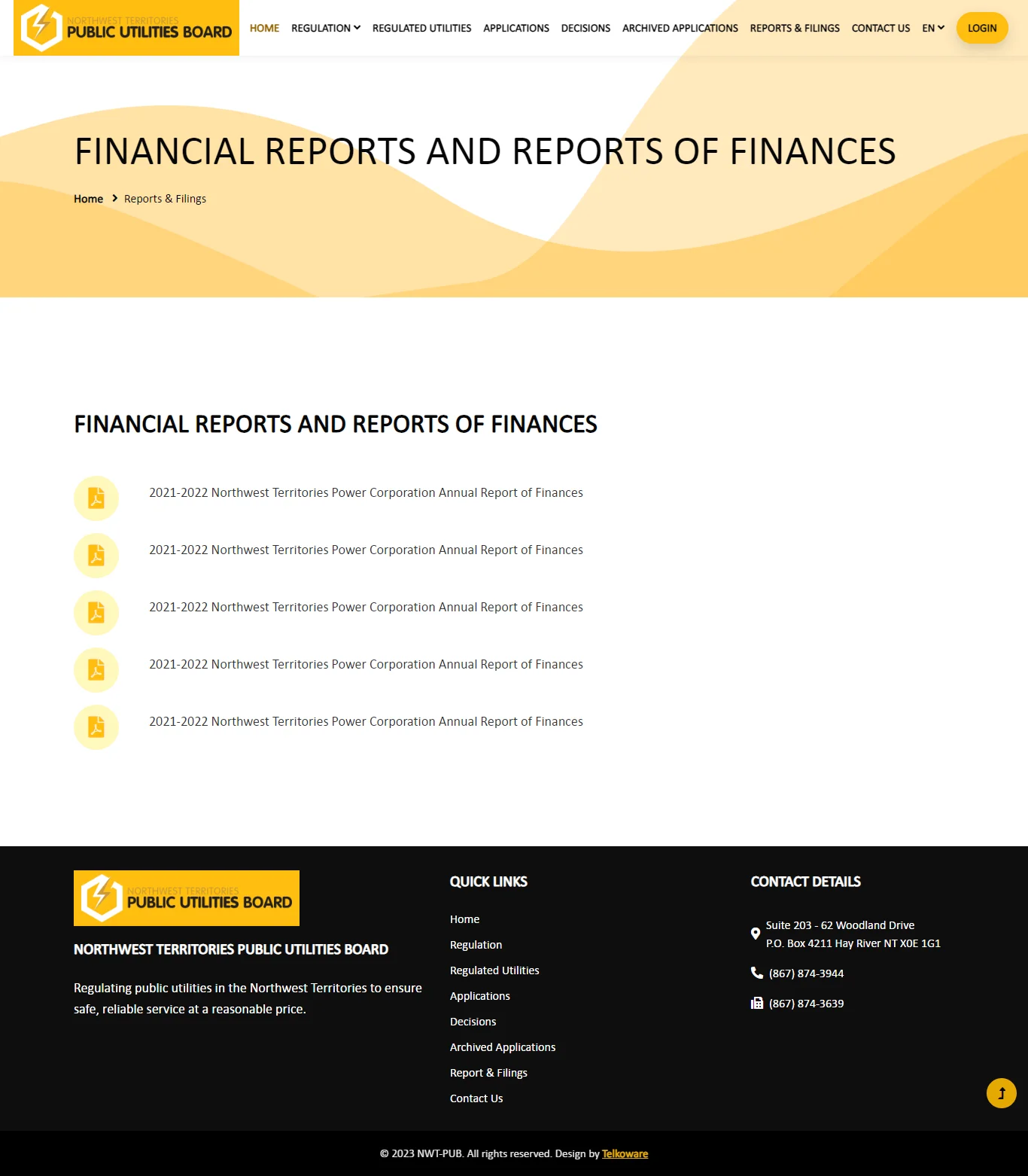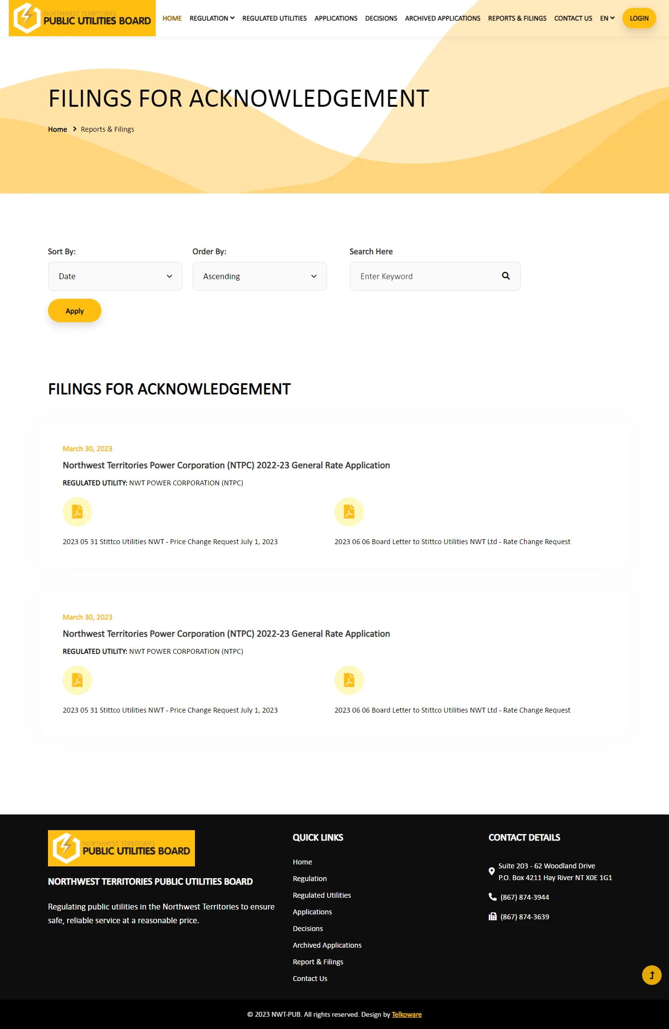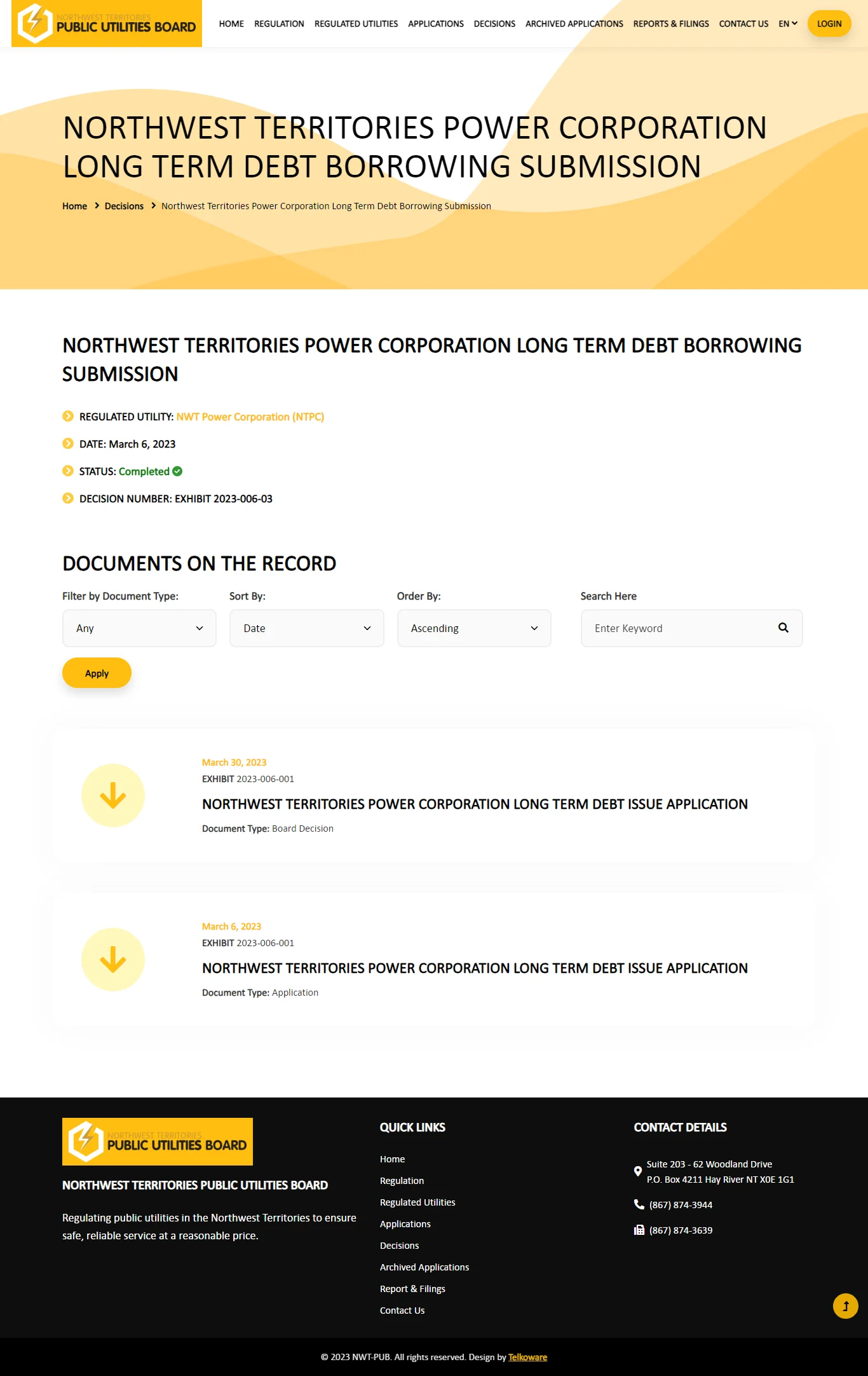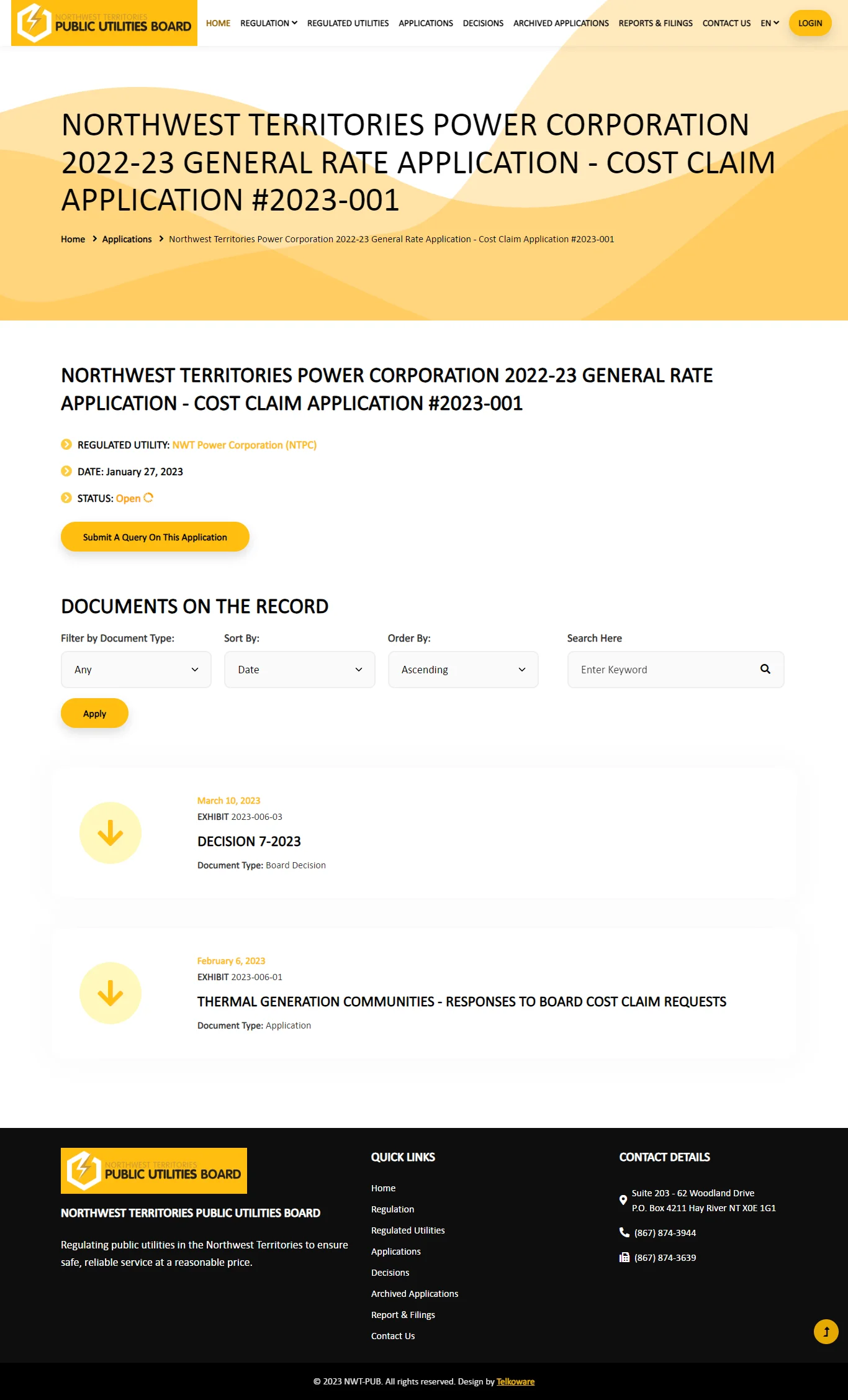 There is also a public website (https://nwtpublicutilitiesboard.ca/) for the general public to view and download all existing content and all open applications and archived applications.