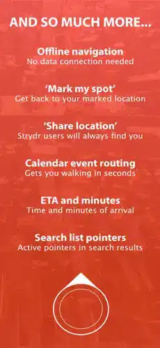 Strydr includes features such as a destination-aligned compass pointer, route and trip planning, powerful place search, and location sharing. Users can plan trips, find nearby places, mark locations, and navigate without relying on constant data connectivity. The app is built with pedestrians in mind, aiming to reduce wrong turns and make city navigation more intuitive and efficient.