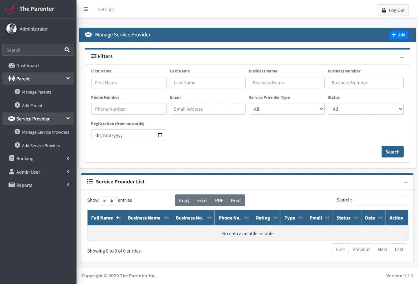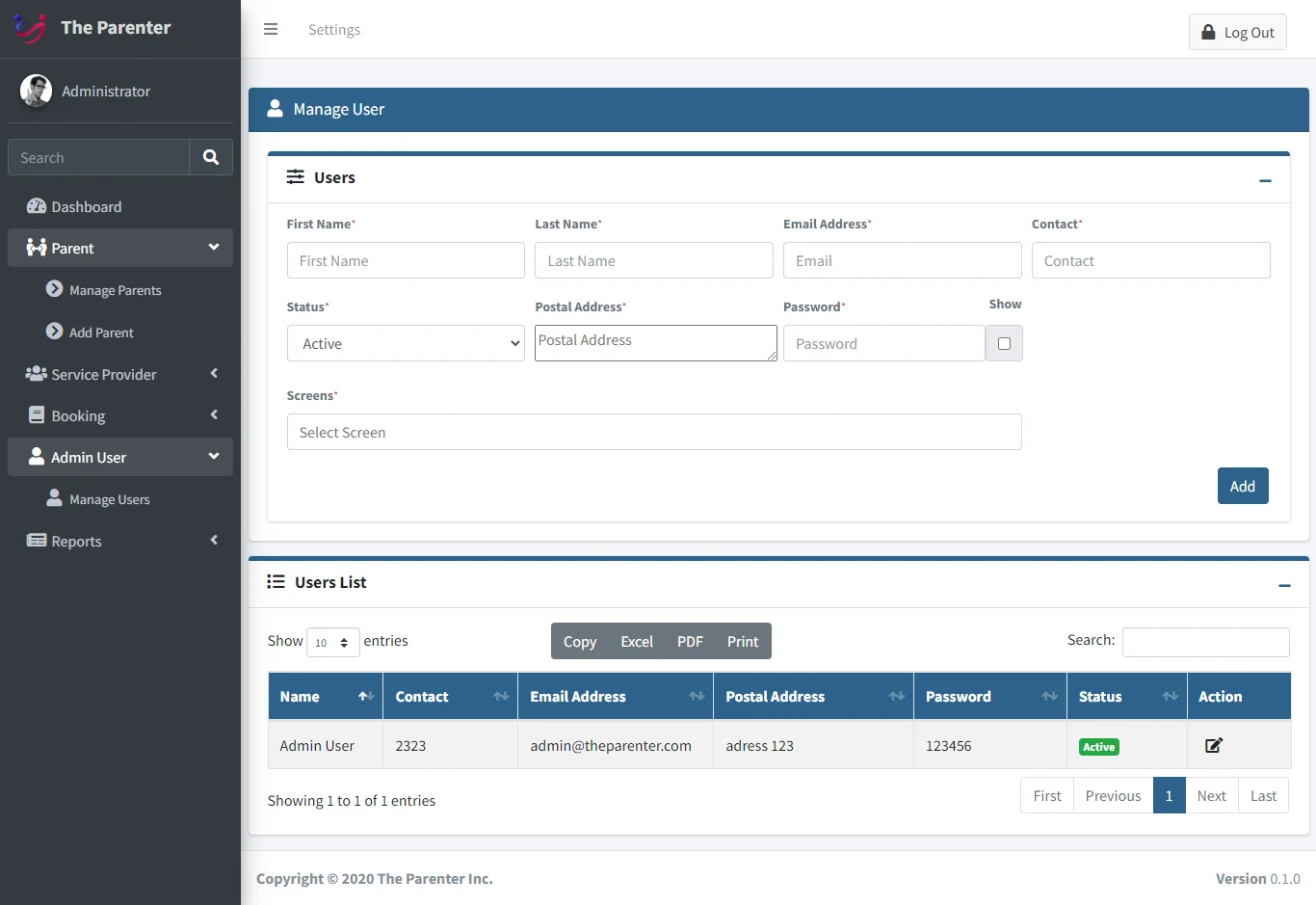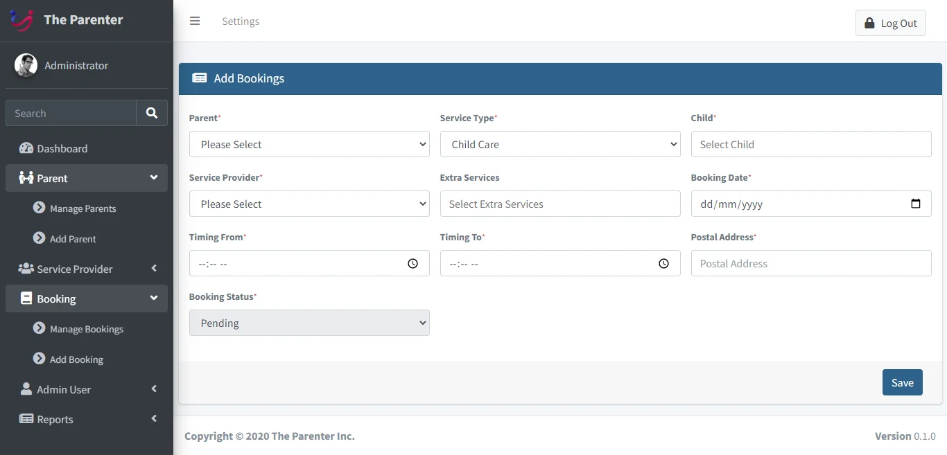 A web-based admin portal, which allows administrators to manage users and service providers, configure service tiers, manage bookings, and view payment details.