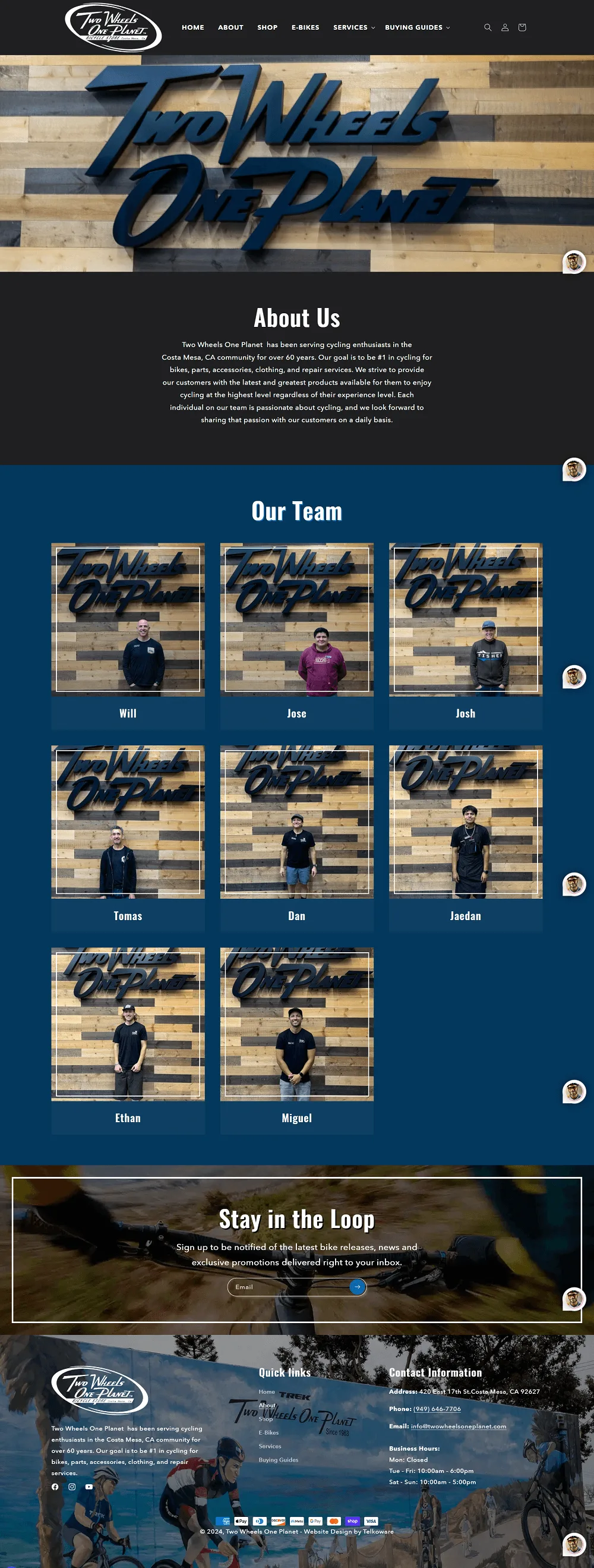Two Wheels One Planet (TWOP) is a bike store, serving cycling enthusiasts in Costa Mesa, California, selling bikes, parts, accessories, clothing and repair services for over 60 years.